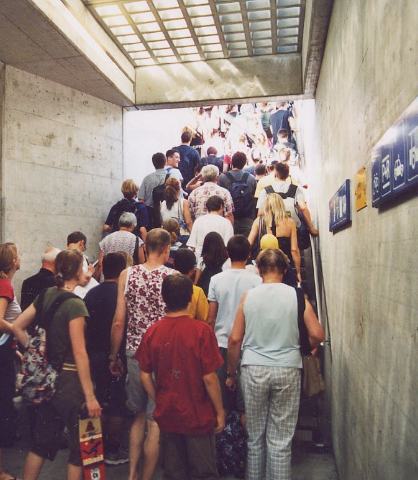 durch eine einzige Unterführung von und zum Mittelperron zwängen.